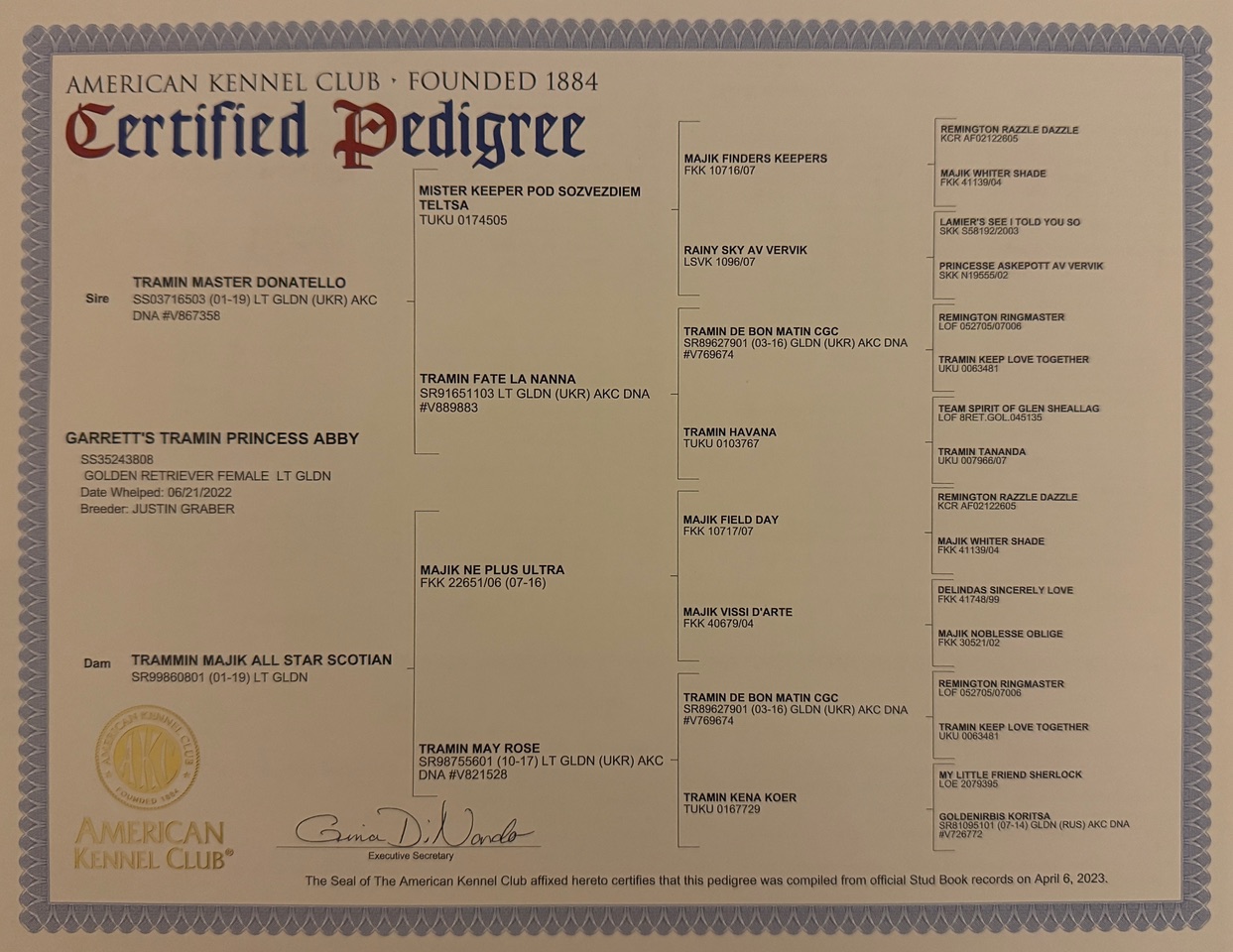 Tricia is a pure bred golden retriever and has cleared all genetic testing. A super family dog who is always interacting with us!